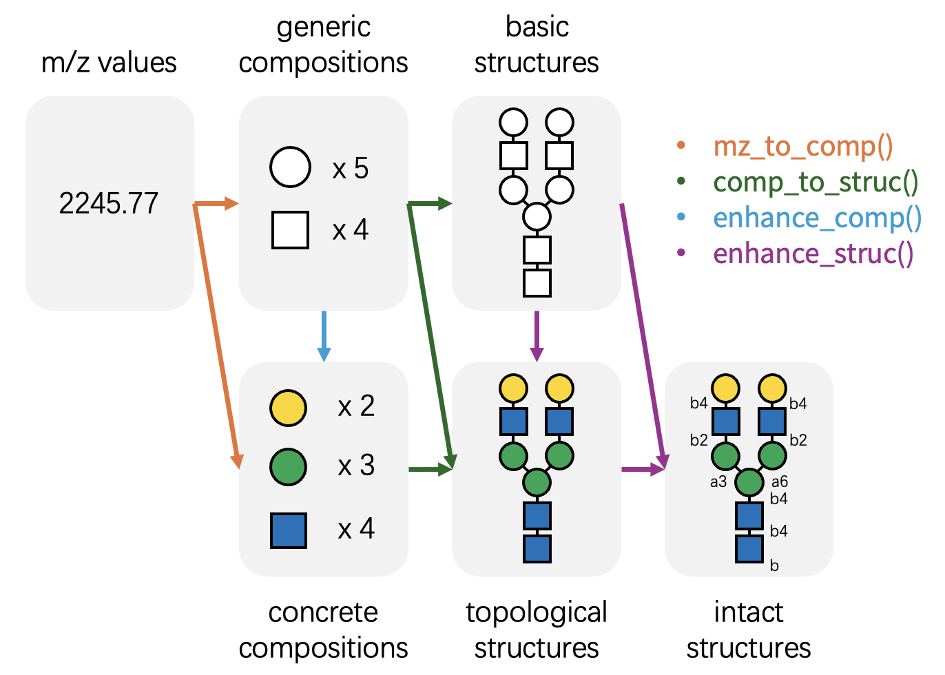 enhance_comp(): Refines generic glycan compositions into concrete, monosaccharide-specific compositions. -