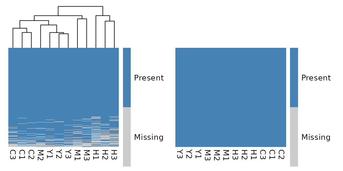 plot_missing_heatmap(exp) + plot_missing_heatmap(clean_exp)