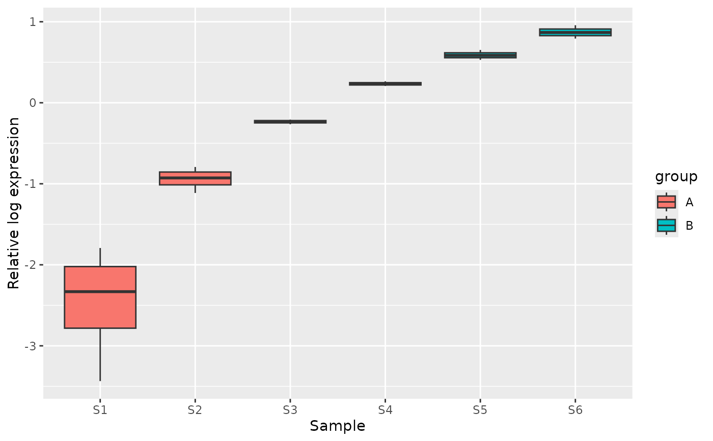 plot_rle.RdDraw boxplots of relative log expression (log2 intensity minus row median) for each sample. Optionally color and group samples by a metadata variable.