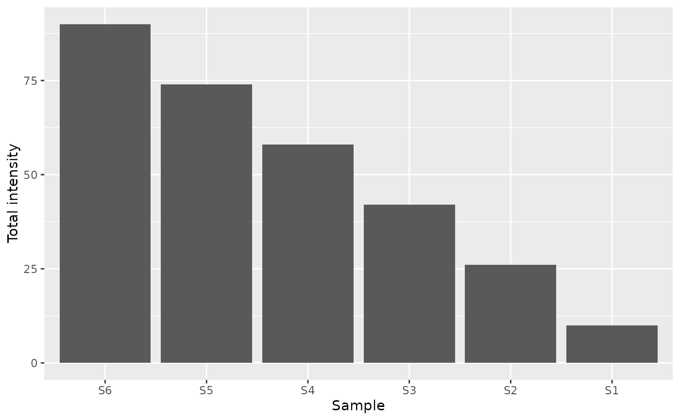plot_tic_bar.RdDraw a bar plot showing total intensity (TIC) for each sample. Samples are ordered from high to low TIC from left to right.