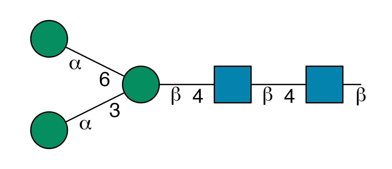 draw_cartoon("Man(a1-3)[Man(a1-6)]Man(b1-4)GlcNAc(b1-4)GlcNAc(b1-")